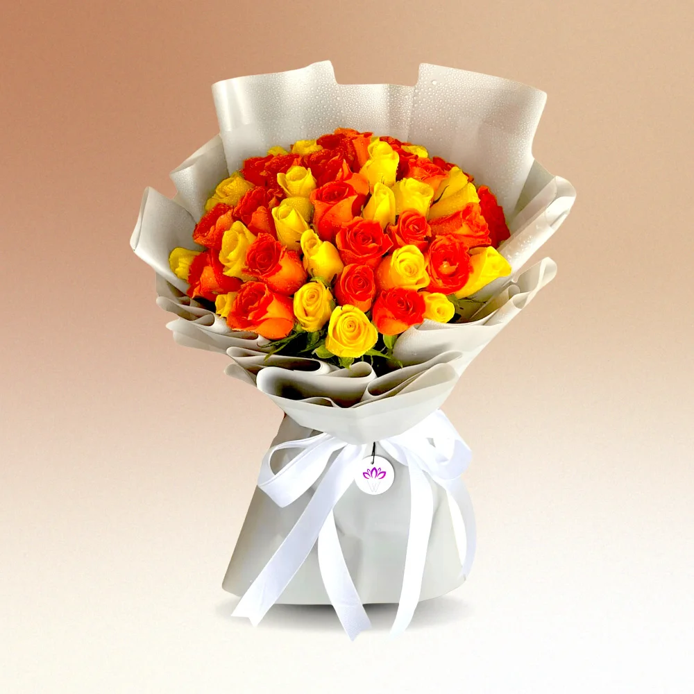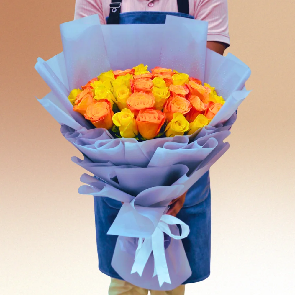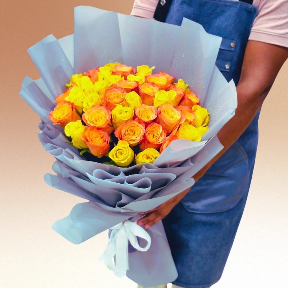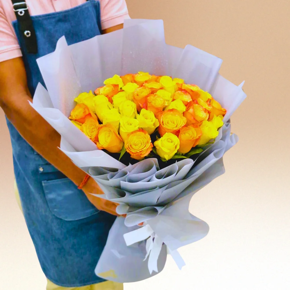 Brighten someone’s day with the enchanting ‘Sunrise Bouquet,’ a radiant arrangement that embodies friendship and joy. This stunning bouquet is a delightful mix of vibrant yellow and orange roses, symbolizing warmth, happiness, and positivity. Each bloom in this arrangement has its own unique meaning: